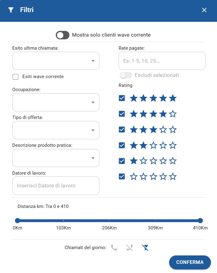 5. Cliccando su "Conferma" verrà effettuata una ricerca dei clienti secondo i filtri applicati