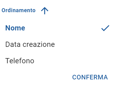 2. Seleziona la direzione degli elementi all'interno della lista attraverso la freccina in alto a destra e successivamente seleziona la tipologia di ordinamento tra "Nome", "Data creazione" e Telefono".