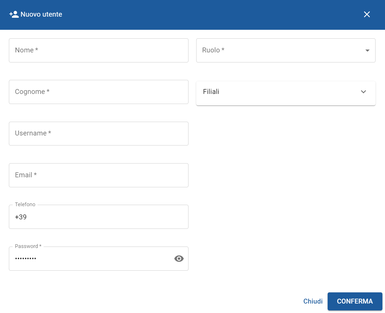 In questa sezione, visualizzabile solo dagli Admin, è possibile effettuare la gestione, creazione, modifica e disabilitazione degli utenti appartenenti al CRM. In questa schermata sono presenti gli utenti attivati sulla filiale selezionata