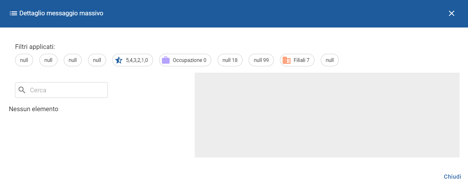 2. Così facendo comparirà una schermata dove sarà possibile visualizzare i dettagli del messaggio tra cui i filtri mostrati nella parte superiore del messaggio, i clienti coinvolti e un'anteprima del testo da inviare.