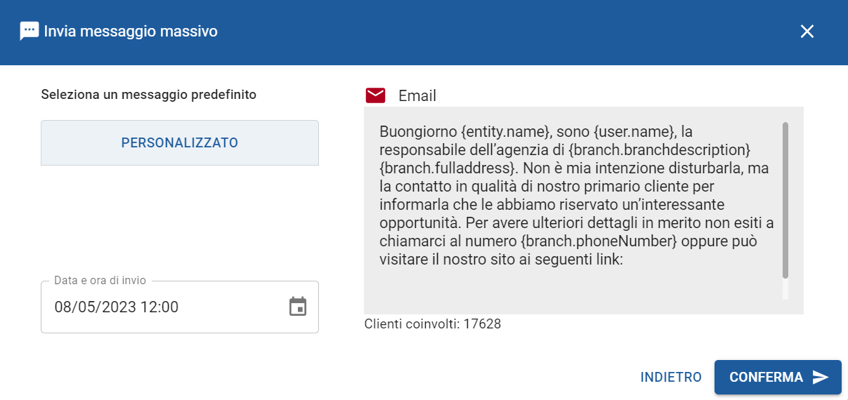 11. Una volta impostati i vari filtri cliccare sul tasto "Conferma" per creare il messaggio massivo.