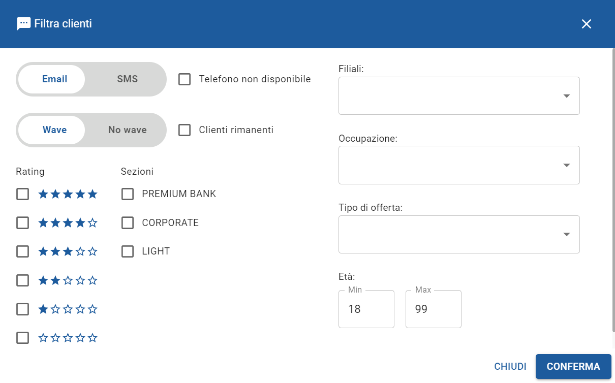 4. Selezionare Wave per inoltrare il messaggio ai clienti appartenenti alla Wave corrente potendo così attivare il flag “Clienti rimanenti” per coinvolgere nell’invio solamente quelli non ancora chiamati.