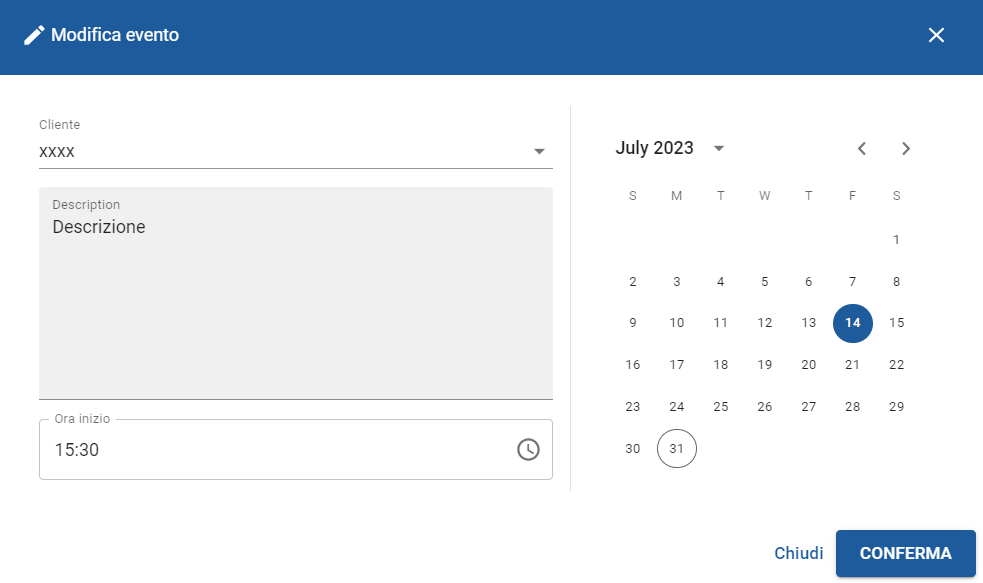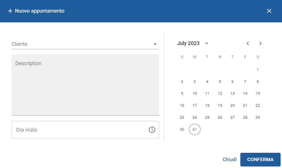 2. Così facendo comparirà una schermata dove sarà possibile inserire: il nominativo del cliente, una descrizione dell'evento, l'orario di inizio appuntamento e il giorno